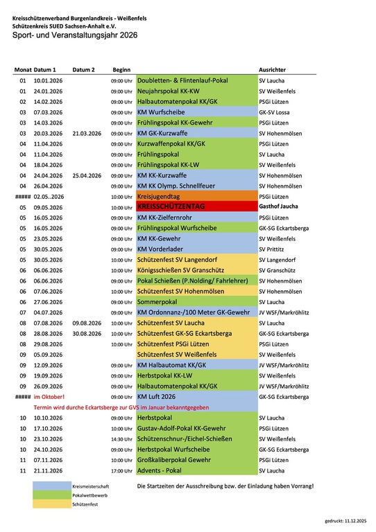 Hier sehen Sie einen Auszug über zukünftige Veranstaltungen des Schützenkreis - SUED Sachsen-Anhalt e.V.